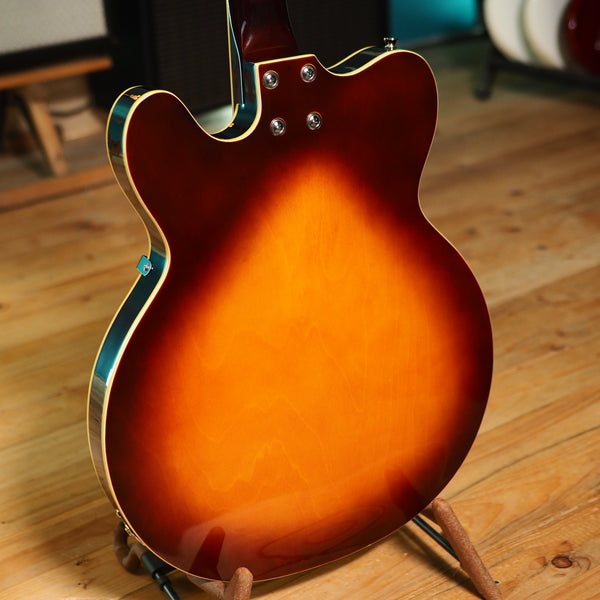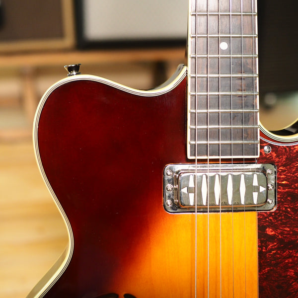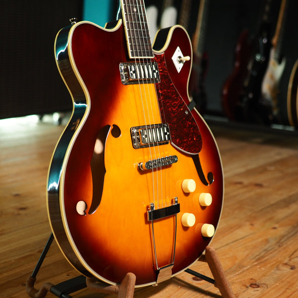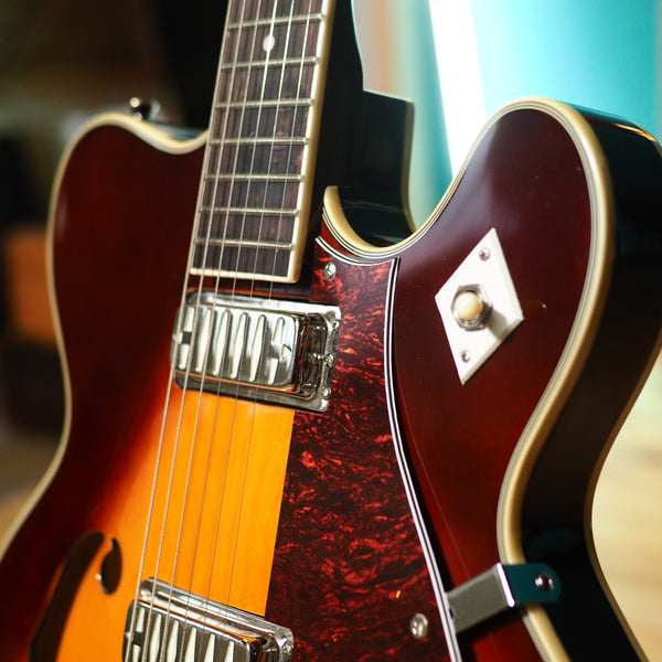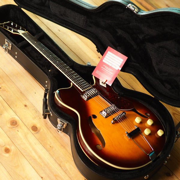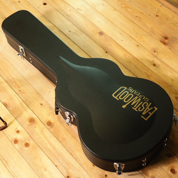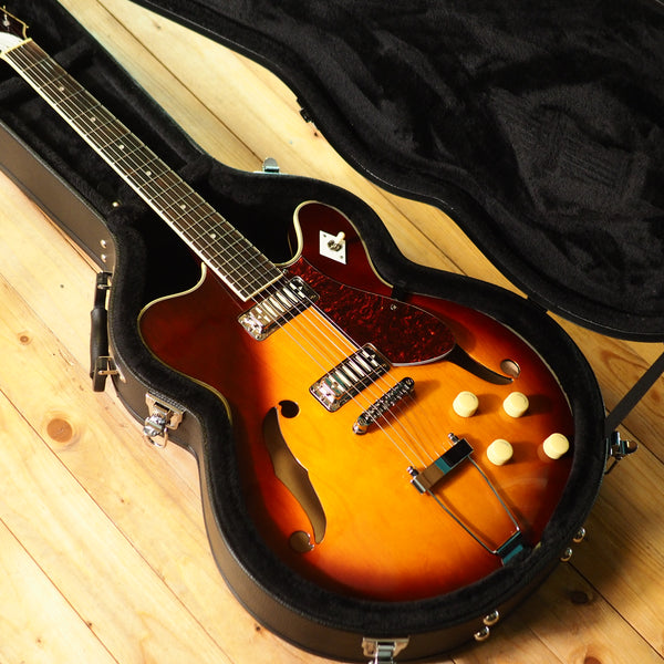 A modern reissue, made by Eastwood, of the original Airline H74 from the 60s. It's a semi-hollow guitar with gold foil pickups and cool styling. With its Gibson scale length, it gives you a traditional semi-hollow feel, but the pickups give you a different flavor than something like an ES-335 would - more sparkle and twang. A great guitar for indie, neo-soul or rock 'n roll. This one comes with the optional and very sturdy original hard case.