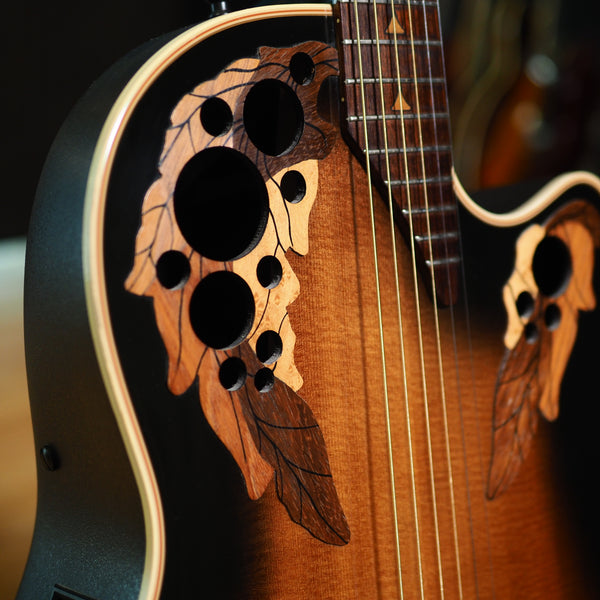 A very pretty, decidedly retro electro-acoustic: this is an Ovation 1768 Elite, made in the US in 1988. It's got a spruce top, deep bowl and cutaway, and of course that beautiful woodwork around the sound holes. It also radiates an upbeat spirit of innovation and trying new ways of doing things - quite touching, in a way.
